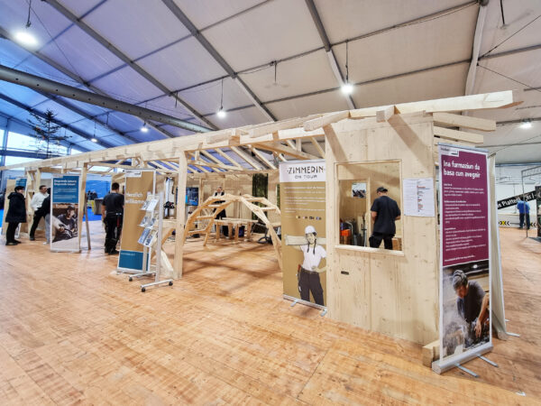 Wer etwas bietet, zieht Menschen an. Richten Sie mit Interessierten einen kleinen Dachstuhl nach Plan auf, bauen Sie eine Da-Vinci-Brücke zusammen oder bieten Sie eine kleine Werkarbeit an. Kurze Aktivitäten, bei denen es nicht zu viel Betreuung braucht, funktionieren gut. Nutzen Sie die Interaktion, stellen Sie Fragen, informieren Sie über den Beruf der Zimmerleute und laden Sie zum Schnuppern ein.