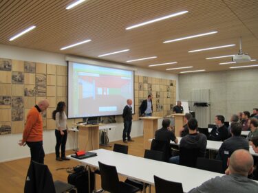 Anne Nyffeler leitet bei PIRMIN JUNG den Bereich VDC&BIM. In dieser Funktion ist sie auch verantwortlich für die digitale Planung ihres künftigen Arbeitsplatzes in Sursee. In ihren Ausführungen gab sie Einblick in diese umfassende Methode und zeigte Beispiele über mögliche Einsatzgebiete auf. Am Beispiel des «Haus des Holzes» konnte sie die praktischen Anwendungen 1:1 erläutern, die Vorteile und Herausforderungen benennen. Sie erklärte, dass BIM sowohl als Methode, aber auch als Werkzeug angewendet wird in der Projektbearbeitung. Besonders spannend für die Anwesenden war dann zu sehen, wie die involvierten Fachbereiche mit der Methode die Zusammenarbeit steuern – als Beispiel der Projektleiter und Holzbauingenieur Oliver Bopp von PIRMIN JUNG und der Projektleiter von Seiten Holzbauer Haupt AG, Franz Küng. Manch Teilnehmer realisierte, dass man beim Thema BIM der Schaltzentrale eines Projekts gegenübersteht.