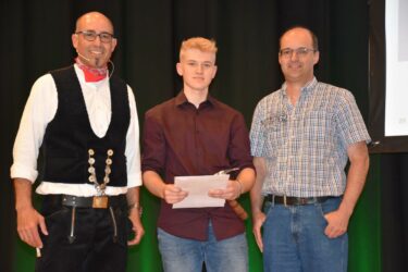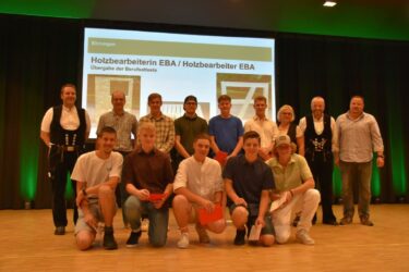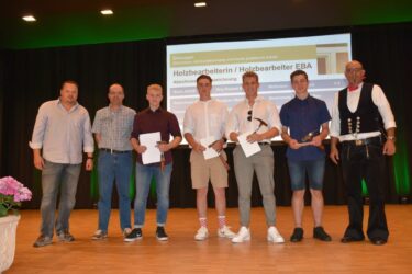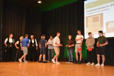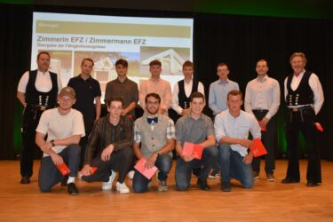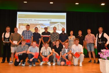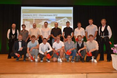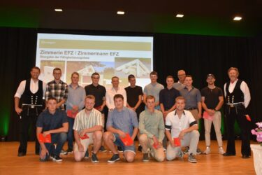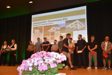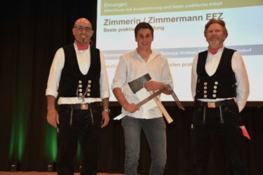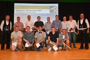 Nachdem alle zehn Absolventen Holzbearbeiter EBA und die 53 Absolventen Zimmermann EFZ ihre Zeugnisse in den Händen hielten, wurden verschiedene junge Leute für die Auszeichnungen nochmals auf die Bühne gerufen, um sie für spezielle Leistungen zu ehren: Bei den Holzbearbeitern Fachrichtung Industrie erreichte Janick Blum, Wey Parkett AG, die Note 5.5 mit Ehrenmeldung und erzielte mit der Note 5.9 eine Glanzleistung für seine praktische Arbeit. Weitere Auszeichnungen, Fachrichtung Werk & Bau, gingen mit der Note 5.6 für die praktische Arbeit an Manuel Lutz sowie Mike Trutmann, beide Brauchli AG Luzern. Sie wurden auch mit den besten Gesamtnoten ausgezeichnet: Manuel Lutz (5.3), Mike Trutmann (5.1) und Kim Geissmann, Burgherr Moosersäge AG, Hintermoos (5.1).