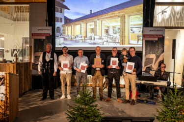 Die Gäste warteten bereits neugierig auf den wohl spannendsten Programmpunkt des Abends, das Lüften der Geheimnisse. Die Objekte in der Kategorie «Holzbauten» wurde von James Cristallo, Vize-Präsident von Graubünden Holz und der Jury, gewürdigt. Für die Zertifikatsübergabe bat er die Anwesenden Akteure auf die Bühne. Die Ränge 1 bis 3 erhielten zusätzlich einen Check, wobei das Preisgeld pro Kategorie insgesamt CHF 6’000 betrug.