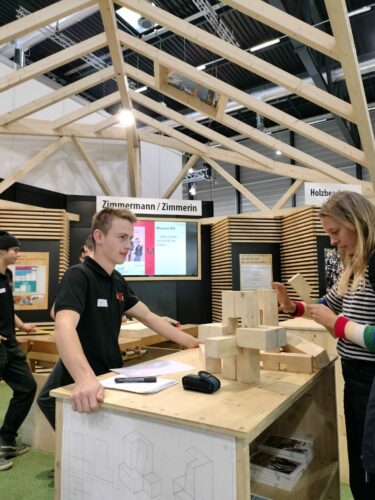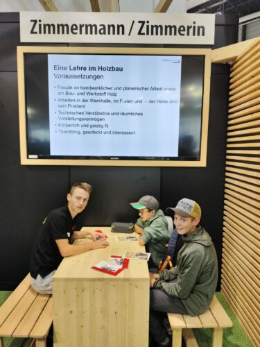 Mit Lara Zwiefelhofer war erstmals eine Zimmerin on Tour am Stand . Generell kann man feststellen, dass der Beruf auch bei jungen Frauen an Beliebtheit gewinnt. So konnten zahlreiche spannende Gespräche geführt und viele konkrete Fragen beantwortet werden. Es zeigt sich, dass der parallel zur Messe und bereits im Vorfeld geführte Online-Auftritt für die Jugendlichen wertvoll ist. Sie können sich damit bereits vor dem Messebesuch über die Möglichkeiten informieren, die ihnen die Berufsmesse bietet. Dass das viele Jugendliche zum Beruf Zimmermann/Zimmerin gemacht haben, beweist die Zahl von knapp 2500 Impressions.