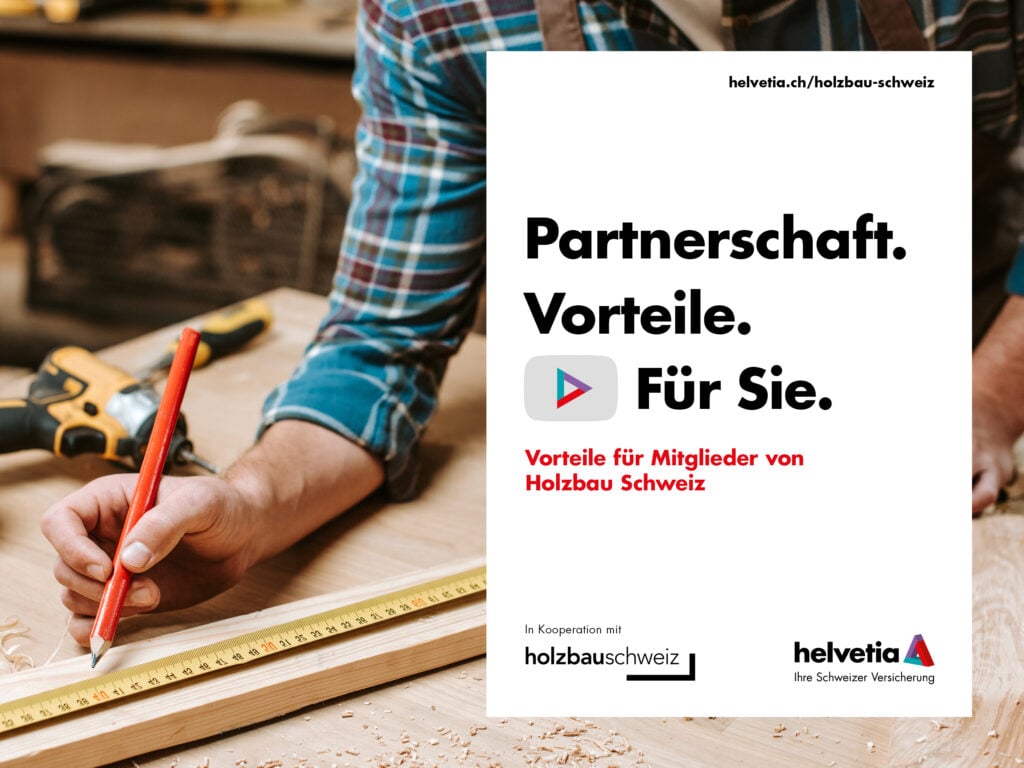 Helvetia Versicherungen und Holzbau Schweiz spannen zusammen – für Ihre Sicherheit! Mitglieder profitieren von exklusiven Vorteilen: Top-Konditionen für Ihre Versicherungslösungen – Insbesondere bei Baugarantie- und Maschinenbruchversicherungen sowie mit Vergünstigungen für Privatversicherungen der Mitarbeitenden. Eine starke Partnerschaft für erfolgreiche Projekte und umfassenden Schutz – beruflich wie privat.