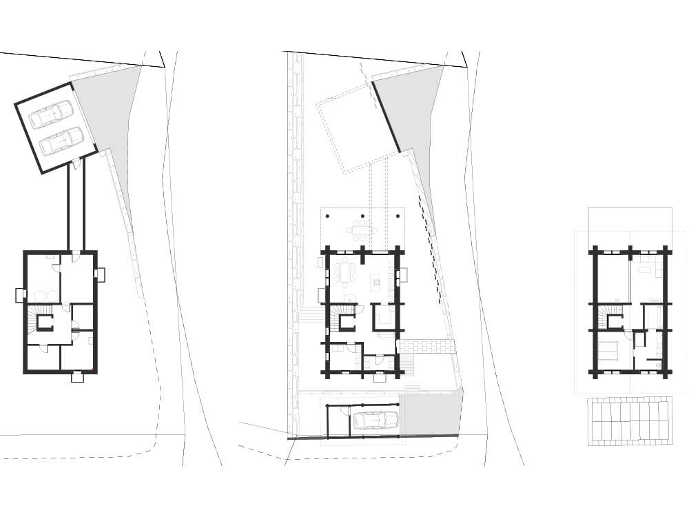 A differenza dei tronchi sovrastanti, lo strato inferiore delle travi è realizzato in abete di Douglas della Valle del Reno sangallese. Con un taglio trapezoidale (l’alburno è stato rimosso) si ottengono come base delle superfici dritte, che talvolta facilitano l’integrazione delle prese di corrente. Al di sopra si erge una parete di tronchi rotondi naturali (abete bianco), che grazie alle giunture cave longitudinali si incastrano perfettamente l’uno sull’altro, risultando stabili e a tenuta d’aria. Per adattare la scanalatura di un tronco alle irregolarità di quello sottostante, la forma del legno inferiore viene rilevata con un cosiddetto compasso da blockbau e trasferita con una matita sul legno superiore. I tronchi della parete interna vengono rifilati su entrambi i lati e successivamente lavorati a mano con l’ascia di taglio.