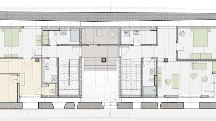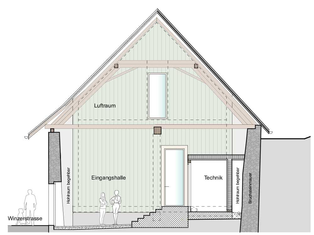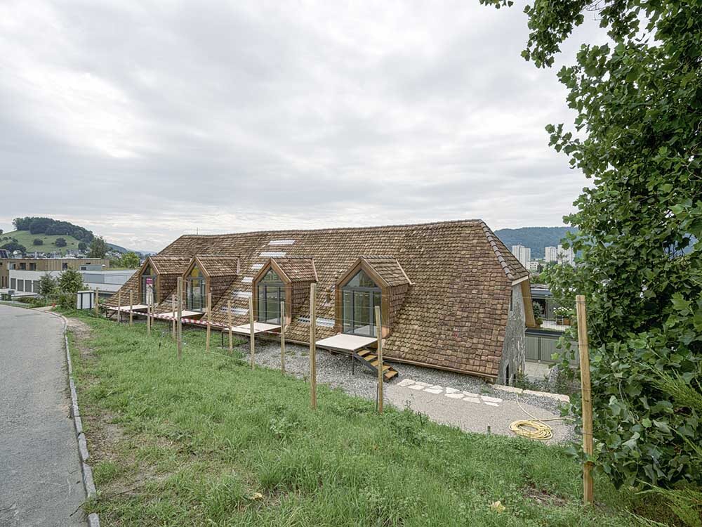 Fino a poco tempo fa, nella Rote Trotte di Wettingen si praticava ancora la pigiatura dell’uva, nello specifico delle uve rosse. Da esse deriva il nome, che significa «torchio rosso». L’ultimo viticoltore si è trasferito tre anni fa, andando ad abitare nello stesso comune in un edificio sostitutivo. Con la continuazione della produzione vinicola nella località si è aperta la strada per una riconversione del vecchio edificio. Bruno Käufeler era cresciuto accanto al locale di pigiatura e ha colto l’occasione per acquistare e risanare l’immobile soggetto a protezione. L’edificio è un lungo rettangolo formato da muri in pietra grezza e da un tetto a capanna con spioventi su entrambi i lati. A 4,50 metri di altezza, trasversalmente al colmo, si trova una possente travatura. La struttura in legno è rimasta invariata, ma le estremità delle travi presentavano gravi danni da marciume. Susanne Vogelsang, amministratrice della Max Vogelsang AG di Wohlen, ha dichiarato che circa la metà di esse ha necessitato di interventi di riparazione. Ciò significa che i carpentieri hanno dovuto incollare e avvitare le travi, spesse circa 22 x 22 centimetri, con giunti a metà legno. La capriata semplice, risalente a diverse centinaia di anni fa, aveva subito danni soprattutto nella parte inferiore. Sul lato in pendenza, il tetto arriva quasi a sfiorare il suolo. In quel punto, i carpentieri hanno rinforzato tutti i travetti della struttura orizzontale con legno nuovo. Susanne Vogelsang, carpentiera e tecnica edile, ha diretto il progetto avvalendosi della grande esperienza dei suoi collaboratori in questo ambito. Insieme al servizio cantonale addetto alla tutela dei monumenti storici, hanno discusso i dettagli e avviato una collaborazione costruttiva. Per la realizzazione architettonica, i collaboratori della Zehnder Bauexperten hanno seguito il principio di «casa nella casa». In questo modo è stato possibile alleggerire l’involucro storico dell’edificio dai requisiti fisici edilizi e realizzare una complesso residenziale moderno.