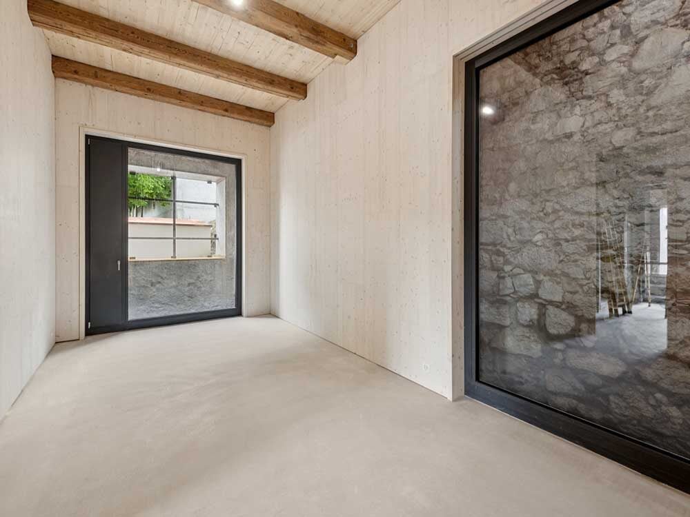 Una nuova piastra di calcestruzzo livella il pavimento, seguita da elementi isolanti, un sottofondo con riscaldamento a pavimento e rivestimento in linoleum. A una distanza di 60 centimetri dalla muratura, i carpentieri hanno inserito nell’edificio non riscaldato una struttura di supporto isolata (spessa 200 mm). All’interno sono stati posati uno strato di installazione e un pannello di abete rosso (30/19 mm), mentre contro la parete esterna è stato aggiunto un semplice cassero in legno (22 mm). Lo spazio intermedio risulta accessibile e l’illuminazione suggestiva mette in risalto la muratura ricca di storia. Gli appartamenti sono riscaldati da una pompa di calore a sonda geotermica, che rilascia calore attraverso il riscaldamento a pavimento.L’ingresso agli appartamenti si trova al centro della facciata longitudinale. Per quanto possibile, le pareti esterne non dovevano essere modificate, tuttavia la sovrintendenza ai monumenti ha permesso l’apertura di finestre nelle pareti e nel tetto. Un’anticamera non riscaldata, che lascia entrare la luce attraverso mattoni di vetro, conduce a due unità abitative: un appartamento di 3½ locali e uno di 4½ locali. Attraverso una scala interna i locatari accedono alla mansarda, dove sono visibili le travi strutturali. Tra di esse, pannelli a tre strati e un isolamento nella zona delle travi completano il tetto. Anche il sottotetto, la controlistellatura e la copertura sono stati rinnovati. Il copritetto ha selezionato le numerose tegole piane danneggiate, completando la copertura con le tegole intatte. I lavori di costruzione in legno sono durati circa 14 mesi, durante i quali hanno operato senza sosta da due a quattro carpentieri.