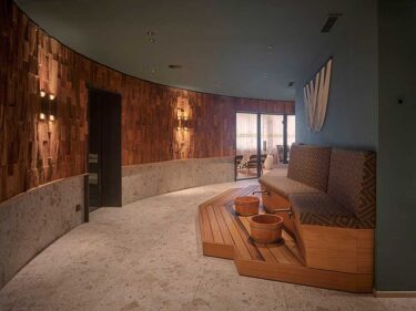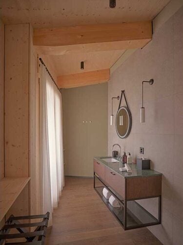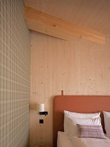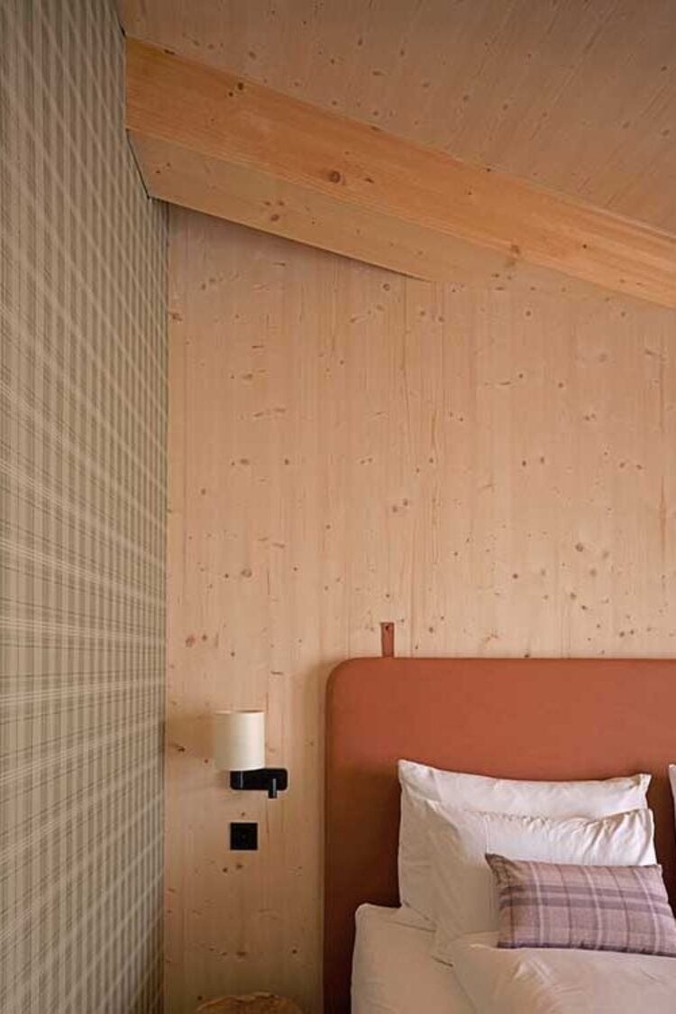 Il seminterrato della dependance, dove si trova un’area wellness con sauna finlandese, biosauna, bagno turco, sala massaggi, vasca immersioni e sala relax, è accessibile da entrambi gli edifici ed è stato realizzato (come il nucleo centrale) in costruzione massiccia. Per il resto, l’edificio di cinque piani è in legno: i solai di rinforzo, ciascuno suddiviso in segmenti trapezoidali, sono costituiti da grandi pannelli in legno lamellare a strati incrociati (CLT) con una gettata di pietrisco di calce, la loro luce teorica arriva fino a cinque metri. Nella parete esterna, lo strato trasversale dei segmenti trapezoidali si tende da montante a montante. Le pareti portanti sono realizzate in legno massiccio da costruzione (C24,