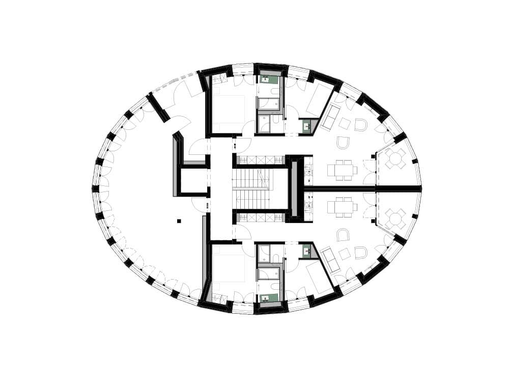 La decisione di progettare una costruzione in legno con forma ellittica di base ha comportato alcune sfide costruttive. Tanto più che la pianta dell’edificio e il tetto presentano forme ellittiche diverse. La pianta della mansarda mostra, a un’attenta osservazione, che la sporgenza del tetto sui lati schiacciati dell’edificio è più corta (80 cm) rispetto agli altri due lati (150 cm). Ne è risultata una geometria complessa del tetto, in cui ogni trave di displuvio presenta un’inclinazione diversa (tra gli 8 e i 10 gradi). Le travi si diramano a raggiera dal nucleo dell’edificio in calcestruzzo e formano sul tetto segmenti trapezoidali, analogamente agli elementi rinforzati del soffitto e del pavimento.