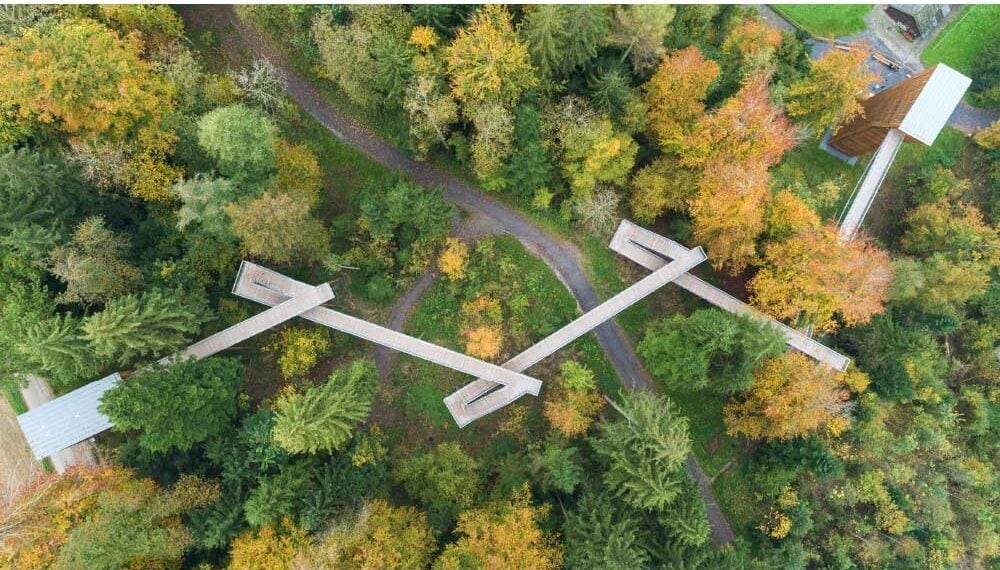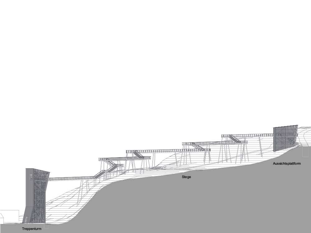 Si inizia con una torre alta 29 metri la cui facciata è piegata su due punti. La struttura è avvolta da lamelle di legno disposte a ventaglio (6 cm × 12 cm / 6 cm × 1 cm) e, a seconda dell’angolo di osservazione, risulta chiusa o aperta e nel complesso molto elegante. Un’apertura invita tutti a entrare e a salire: le scale larghe 1,68 metri conducono verso l’alto mantenendo un’andatura gradevole. Chi vuole prima prendere fiato può ammirare una sorta di gigantesca pista per biglie, che prende forma dietro al primo giro di scale: un omaggio al committente da parte del costruttore. Le scale fanno parte dell’idea di fondo del progetto. I visitatori devono respirare più velocemente e allenarsi visitando la struttura. A un’altezza di 22 metri accedono a un ponte supportato da cui la vista verso il basso è davvero mozzafiato. I visitatori continuano a camminare all’altezza delle cime degli alberi, attraversano la passerella fino a raggiungere nuovi gradini e pedane che cambiano bruscamente direzione e consentono di ammirare il panorama a 360°. Dopo quattro di questi bruschi tornanti, 350 metri di percorso e un dislivello complessivo di 45 metri, raggiungono la piattaforma panoramica Vogelwinkel. Qui la vista si estende sui campi e sulle case, fino alle montagne, passando per il lago di Zugo. Cyrill Schmid è responsabile produzione presso Abt Holzbau AG a Baar. Il progetto era stato predisposto dallo studio di architettura 2Eck Architekten di Baar per un concorso della corporazione Baar-Dorf. La passerella doveva essere per la popolazione di Baar, un sistema per spingere chi visita il bosco a macinare tanti gradini, e anche un modo per pubblicizzare il legno svizzero. Per la realizzazione era richiesta una certa rapidità. Abt Holzbau AG è ricorsa all’aiuto di altre tre imprese di carpenteria, Hürlimann Holzbau AG e Hitz Holzbau AG, nonché Neuen Holzbau AG di Lungern (OW). Affinché potessero far fronte agli agenti atmosferici, per le parti calpestabili e le facciate i carpentieri hanno scelto il legno di abete di Douglas, dotato di una protezione naturale contro le muffe e il marciume e con il vantaggio di una lunga durata e stabilità. I montanti in legno tondo sono tronchi di abete rosso. Questi crescono dritti, sono quasi circolari e hanno pochi rami. In questo modo è stato possibile soddisfare i requisiti statici e geometrici nonché la lunga durata richiesta. I loro diametri sono quasi identici, circa 45 centimetri. I più lunghi dei 61 montanti misurano circa 14 metri.
